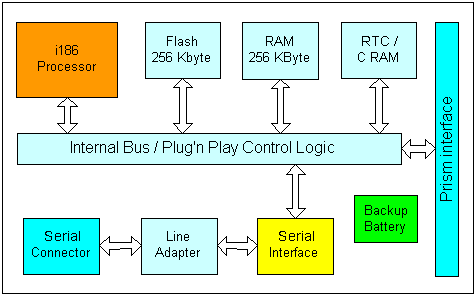 Prism 310 est une carte processeur équipée d'un i186 de Intel. Ce module est idéal pour le contrôle de systèmes à complexité standard. Ce contrôleur est livré avec le micro-code OS Prism. Schéma bloc :