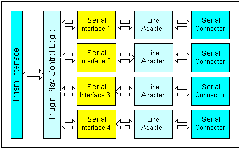 Prism 351 est une carte possédant 4 interfaces séries RS 232 pour communiquer avec des sous-ensembles externes. Schéma bloc :